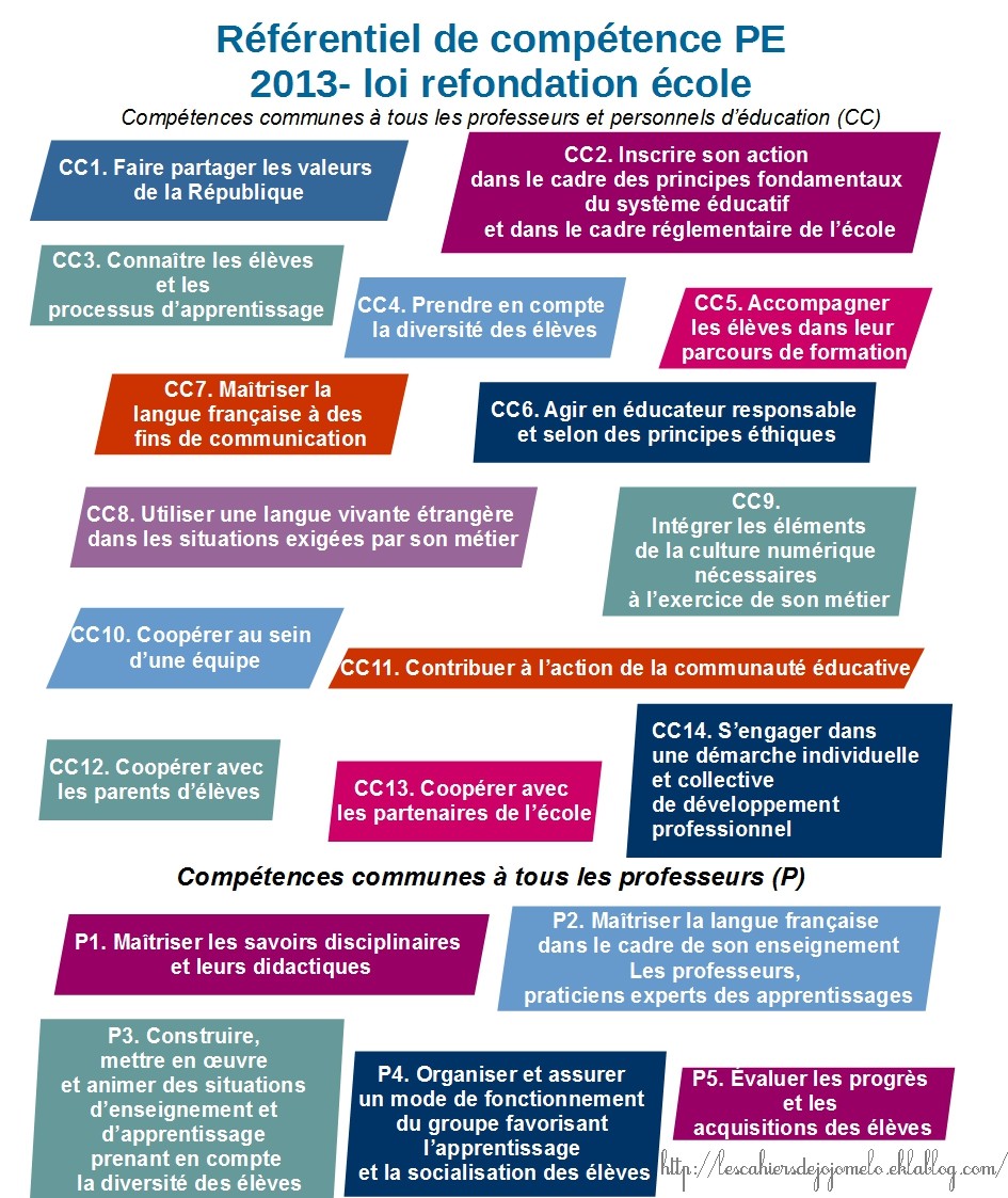Le référentiel des compétences professionnelles des métiers du professorat et de léducation tel quil figure dans larrêté du 1 er juillet 2013 se fonde sur la définition de la notion de compétence contenue dans la recommandation 2006962CE. Compétences communes à tous les professeurs. La liste des compétences que les professeurs professeurs documentalistes et conseillers principaux déducation doivent maîtriser pour lexercice de leur métier est publiée au Bulletin officiel du 25 juillet 2013.