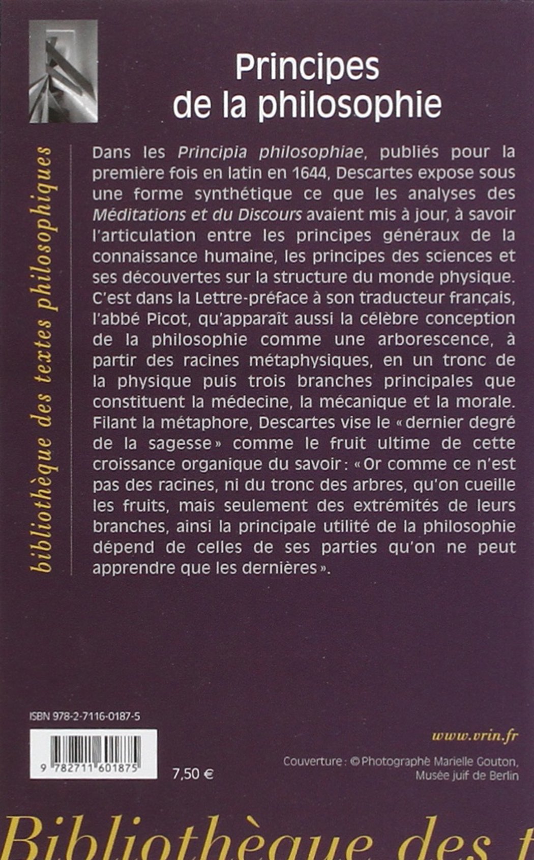 Lorsque Descartes publie ses Principes de la philosophie en 1647 il est en pleine possession de sa méthode et des résultats quelle lui a permis dobtenir dans différents champs scientifiques ainsi quen métaphysique. Principia Philosophiae is a book by René Descartes. Descartes Les Principes de la philosophie 1681 En 1681 alors que le philosophe français René Descartes 1596-1650 est mort depuis trente-et-un ans paraît une quatrième édition française des Principes de philosophie.