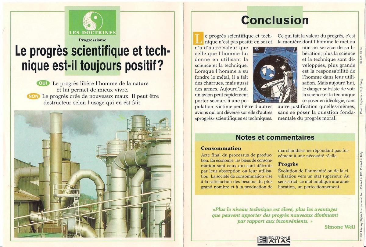 Cest à dire est ce que toutes les avancés acquise par le progrès ont permis à lHumanité de mieux survivrese développer que si il nexistait pas. Cest à nous citoyens quil appartient de définir ce que sera le progrès scientifique. Progressisme Le progrès scientifique et tech nique estil toujours positif Le prog r ès libère lh o mm e de la na tur e e t lui p er met d e mi eu x v iv r e.